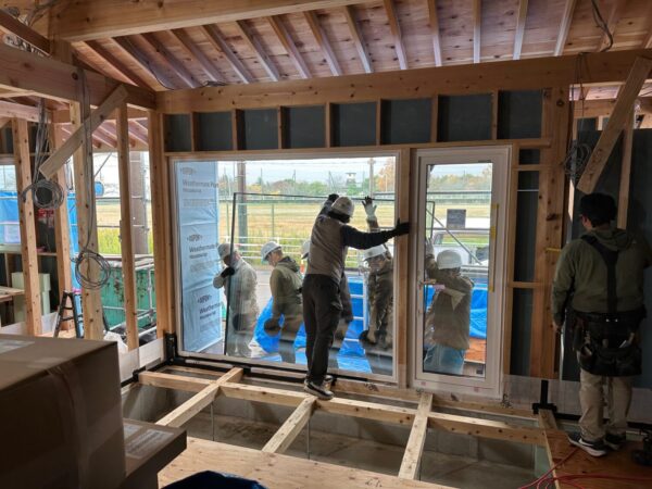 大人6人、息を合わせてガラスをはめ込みます。現場にいました監督の佐藤さんに重さを聞いたところ140kgもあるとのことです。トリプルガラスで大開口のガラスなのでかなりの重量です。
