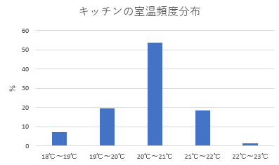 キッチンは床下エアコンの設置場所に近いということもあり、22℃を超える時間もありました。こちらも室温20℃以上の時間が多く、安定していることがわかります。