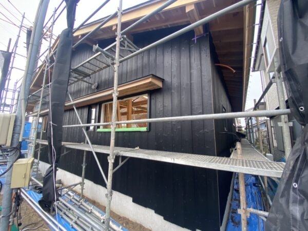 外部は下地組みが終わり、他との絡みがある正面部分以外は焼杉が貼り終わっています。