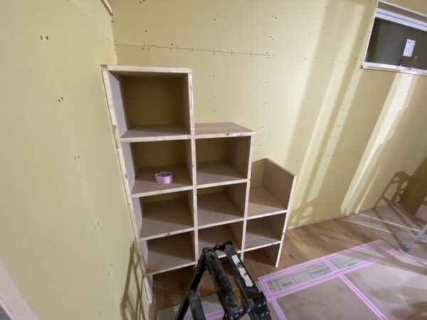 造作家具などが出来上がって左官工事(漆喰仕上げ)が始まります。