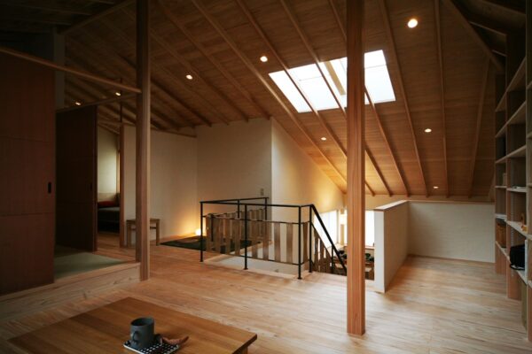 勾配天井にすることで縦方向への空間の広がりが生まれ、一般的な平らの天井より開放感のある空間にすることができます。