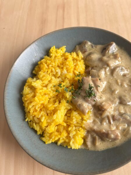 昨年の人気メニューのフリカッセが、さらに進化して新登場しました。進化のポイントは2つ。まず、ライスが今年から鮮やかなターメリックライスに変わりました。口当たりがふんわりと軽く、スパイスの香りが絶妙なアクセントを加えています。そしてキノコも「ホワイトマッシュルーム」に変更し、深みのある味わいを引き出しました。これにより、フリカッセ全体のバランスが一層引き立っています。