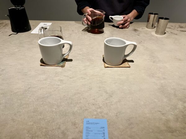 少し緊張して、店内に足を踏み入れると、そこにはシンプルでモダンな空間が広がり、まるで「実験室」のような雰囲気。このカフェでは、焙煎や抽出方法を自由に組み合わせて自分なりのコーヒーを楽しむことができるのですが、今回はバリスタさんに淹れていただくことにしました。