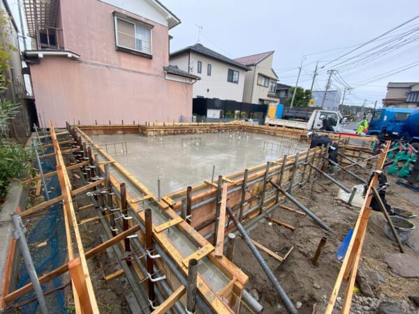 中央区の現場は、基礎工事着手中で、スラブと立上りの一体打ちが完了しました。
