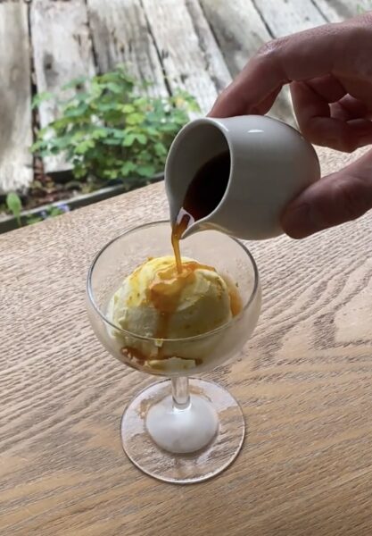 擦ったオレンジの果皮が乗ったバニラアイスに、温めた日本酒とコーヒーをお好みの量かけてお召し上がりください。香りと味の絶妙なハーモニーをお楽しみいただけます。