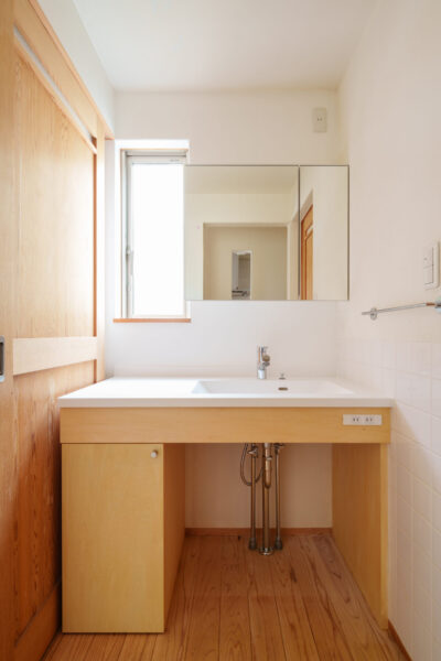 洗面は造作でご提案させていただきました。洗面台の幅は最大限に造り、収納付です。前の洗面台が既製品の物だったのでかなり印象が変わったかと思います。
