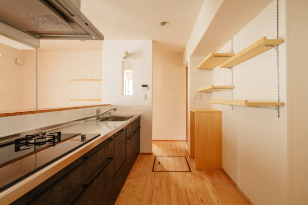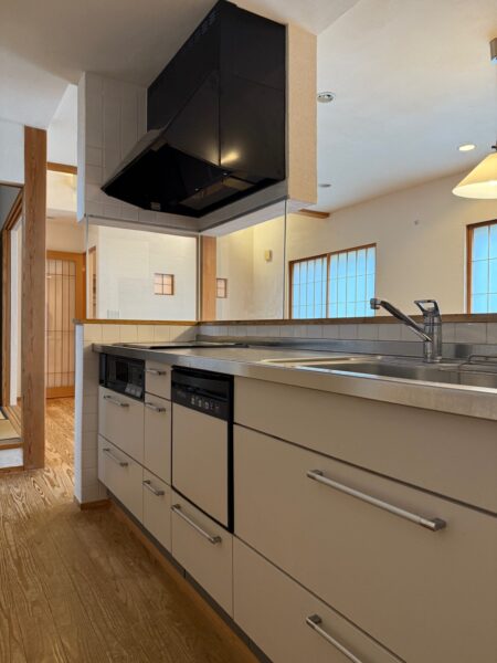 システムキッチンも交換させていただきました。建主さまご希望のガスとIHのハイブリッドのコンロが入っております。食器棚の方は可動棚をの設け、空いているスペースは現在、お使いになっている食器棚が入るように設計しております。