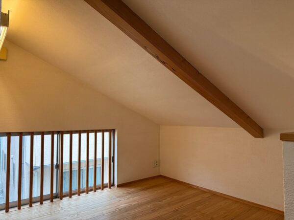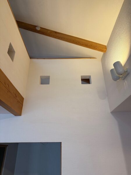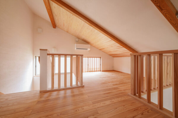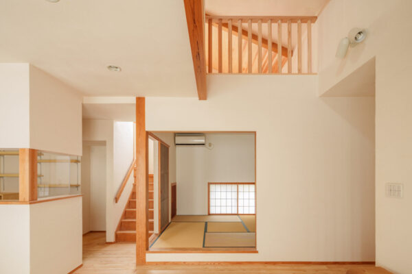 吹抜け部分は腰壁を壊し、格子の手摺にすることで開放感と室内の明るさを確保しました。