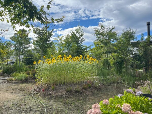モデルハウスの庭の向日葵が咲き始め、いよいよ夏らしい季節が訪れました。向日葵はその鮮やかな黄色と力強い姿で、庭を明るくし、訪れる人々に元気を届けています。