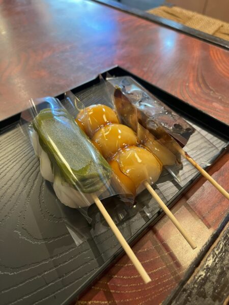 また、今年は少し時間があったので黒塀通りを散策しながら、越後岩船家で一休み。村上茶あんのお団子を3種類、みたらしと味噌などを楽しみました。ふっくらとした食感とそれぞれ異なるタレの味わいに心が癒されました。