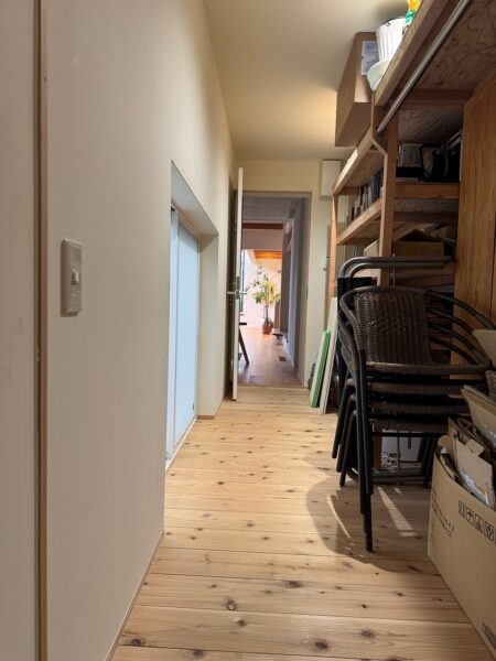 品ぞろえが豊富になってきたサンプルやカタログ、イベント用品。スタッフも増えコートや上着をかけるハンガー掛けも必要になりましたので展示場休館日に大工にお願いして木製で棚やコート掛けをつくりました。お客様の目に触れない場所に設けたことで、見える空間がすっきり保てるし裏側は効率よく収納できる――まさに理想的な整理整頓の仕組みだと思います。ナチュラルな仕上げで。お金を掛けないように作ってみました。木のままの質感って、塗装仕上げにはない素朴さや温かみがあって、裏方の収納家具でも「ちょっとした安心感」を与えてくれると思います。