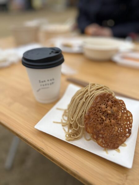 食後には、モリーゴーランドでもご一緒した「SAKAUECOFFEE」さんのコーヒーをお供に柏崎の「とらや菓子店」さんのモンブランプレートをいただきました。モンブランプレートはイベント出店とは思えないほどの繊細な仕上がりに、思わず“ここカフェだったっけ?”と錯覚するほど。栗の風味がしっかり感じられて、コーヒーとの相性も抜群。お腹も心も満たされて、秋の味覚フルコースが完成しました。