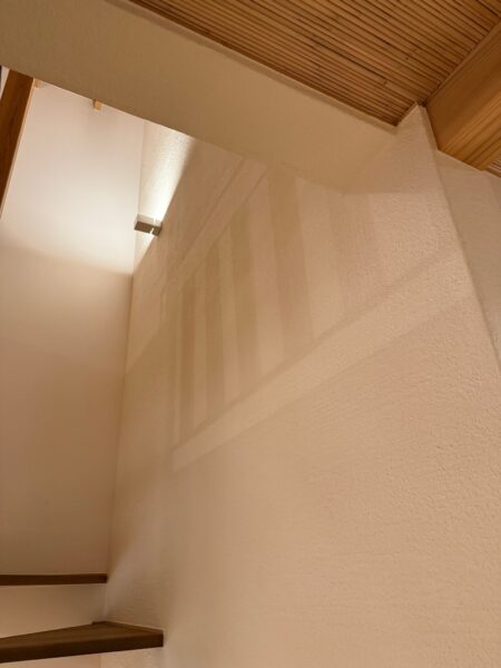 太陽光が気持ち良く入り、室内が明るい日中ももちろん素敵ですが、暗くなり灯り溜まりや陰影ができる夜の空間もとても綺麗です。照明の位置や明るさ、色味によって、木の質感や漆喰壁の表情がやわらかく浮かび上がり、昼とは違う落ち着いた時間を演出してくれます。