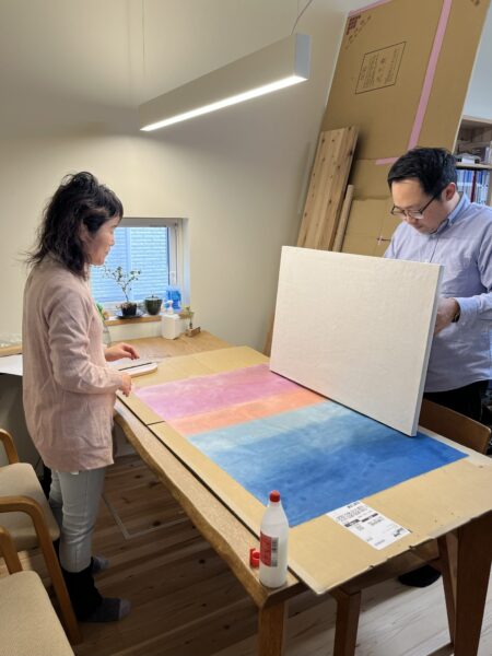 この染紙アートは、スタッフの竹村さんと渡邉さんが和紙をキャンバスに貼り付けて制作したものです。手作業ならではの温かみがあり、自然の空気をそのまま閉じ込めたような仕上がりになっています。