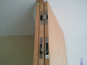 下の写真は玄関戸の隠し丁番と電気錠の金具です。