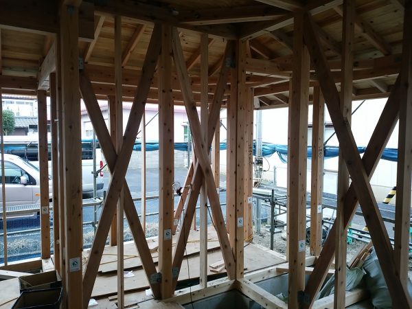 現在は屋根の下葺きを終え、筋交いや金物の取付中です。