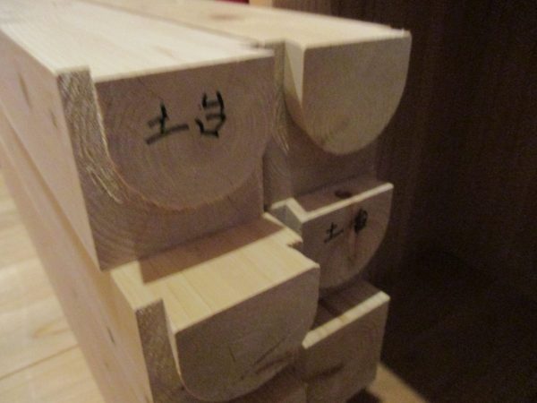 先日建前に使う桧材が搬入され、現在モデルハウスのパントリーに仮置きされています。