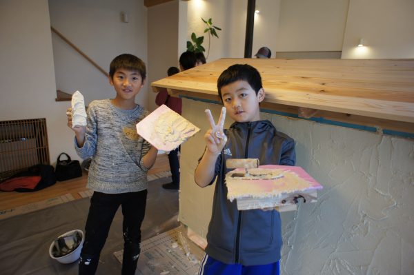佐藤左官から塗り方を教わります。目がキラキラ!