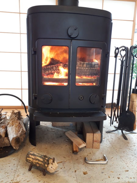 展示場では ストーブに火を入れて柔らかな暖かさと