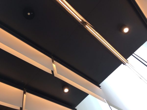 ホールの天井には布状の垂れ幕が下がり、その間には照明器具が仕込まれています。