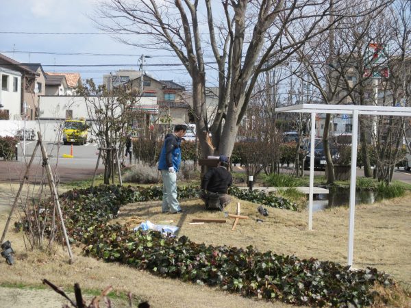 今日は朝から大工さんが来て、展示場のケヤキの木の前で作業中です。