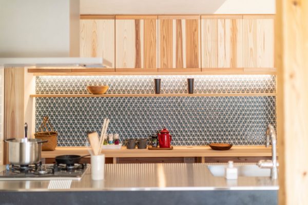 食器棚の下に施した間接照明が、優しく照らす和柄のタイル。
