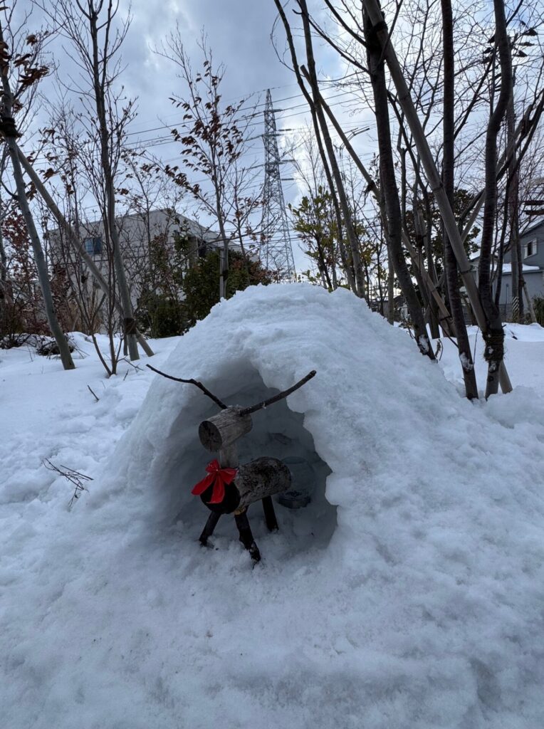 とても良い雰囲気なので、真っ白なHARUMACHIガーデンに、ちょっと大きめの『かまくら』を作ってみました。中にはトナカイが入ってトナカイのハウスのように。今週末も寒波が居座るようですのでカフェに来られたお客様に楽しんで頂けるとおもいます。ご来店されたお客様は是非探してみてください。