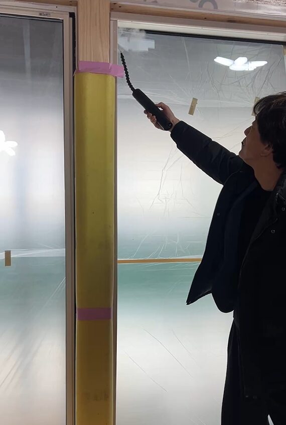 写真は、いわゆるスモークマシン(正式名称は異なるかもしれませんが…)を使って、建物内の漏気を確認している様子です。煙の動きによって空気の流れを可視化し、数値だけでは分からない部分までチェックしていきます。