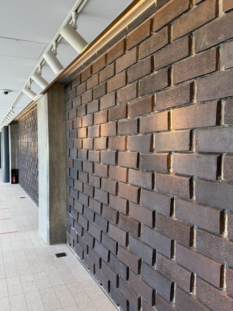 前川國男さんと言ったらこの煉瓦タイル壁です。コンクリート打放し壁の劣化を防ぐために開発されたものです。