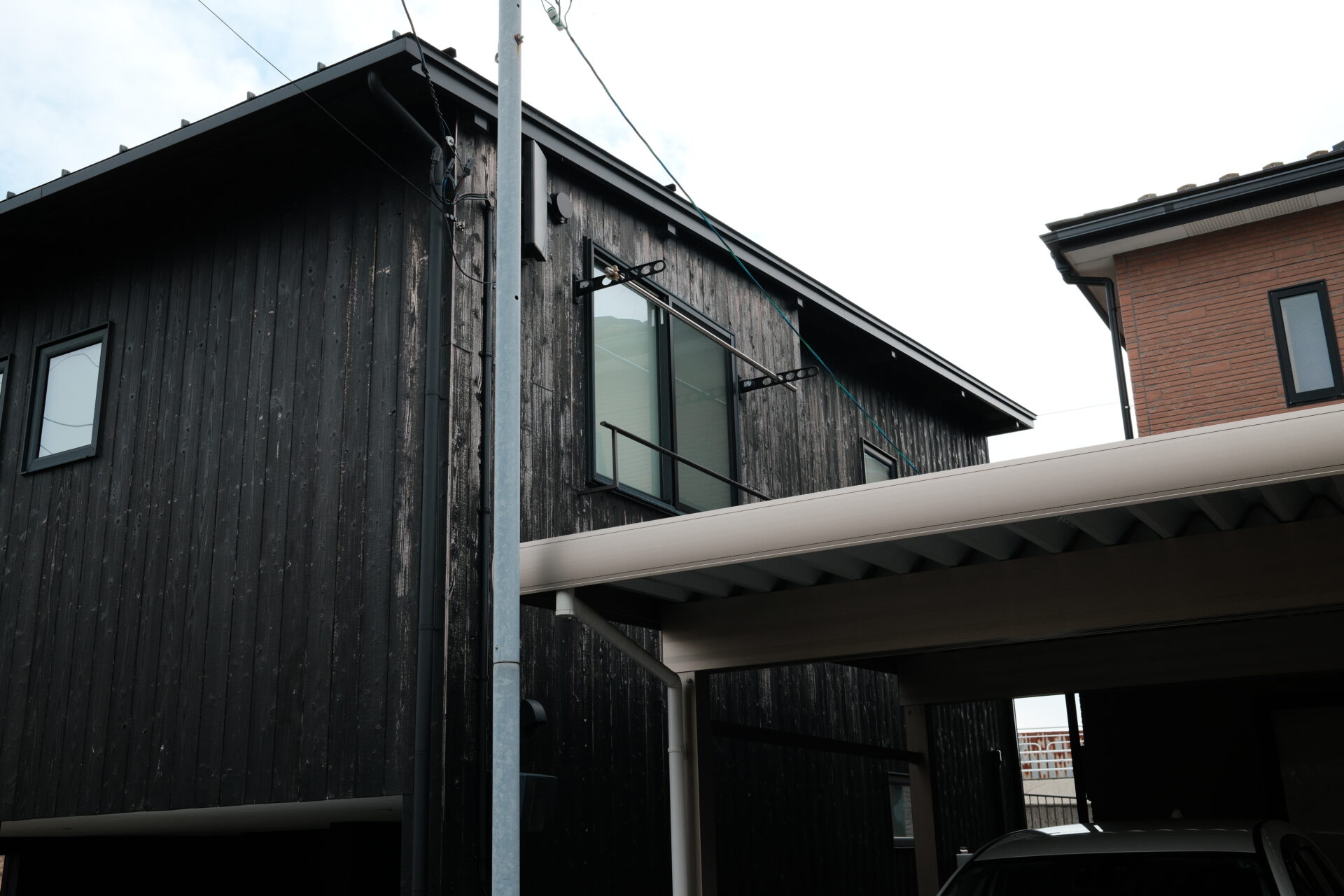 隣家のカーポート上の、焼杉(表面塗装品)の表面の塗装がだんだん剥がれてきています。この写真を見るだけでもどれだけ北西側からの雨風による影響が大きいかがわかります。