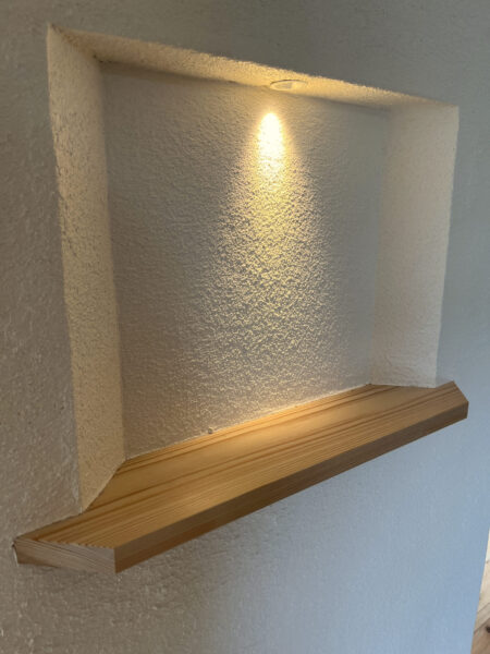 ノモトホームズでは、壁の仕上げ材としてよく「漆喰(しっくい)」を採用しています。写真では一見するとシンプルな白い壁に見えるかもしれませんが、実はわずかに土を混ぜて仕上げています。この絶妙な配合が、真っ白とは一味違う、やわらかく奥行きのある表情を生み出すのです。