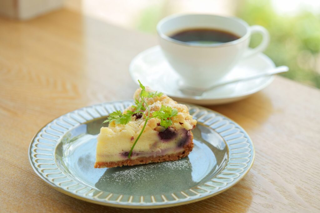 コーヒーの透明感ある酸味がチーズケーキのコクをほどよく引き締め、 ブルーベリーの甘酸っぱさと果実味が静かに響き合い、 ひと口ごとに上品な余韻がすっと広がっていきます。