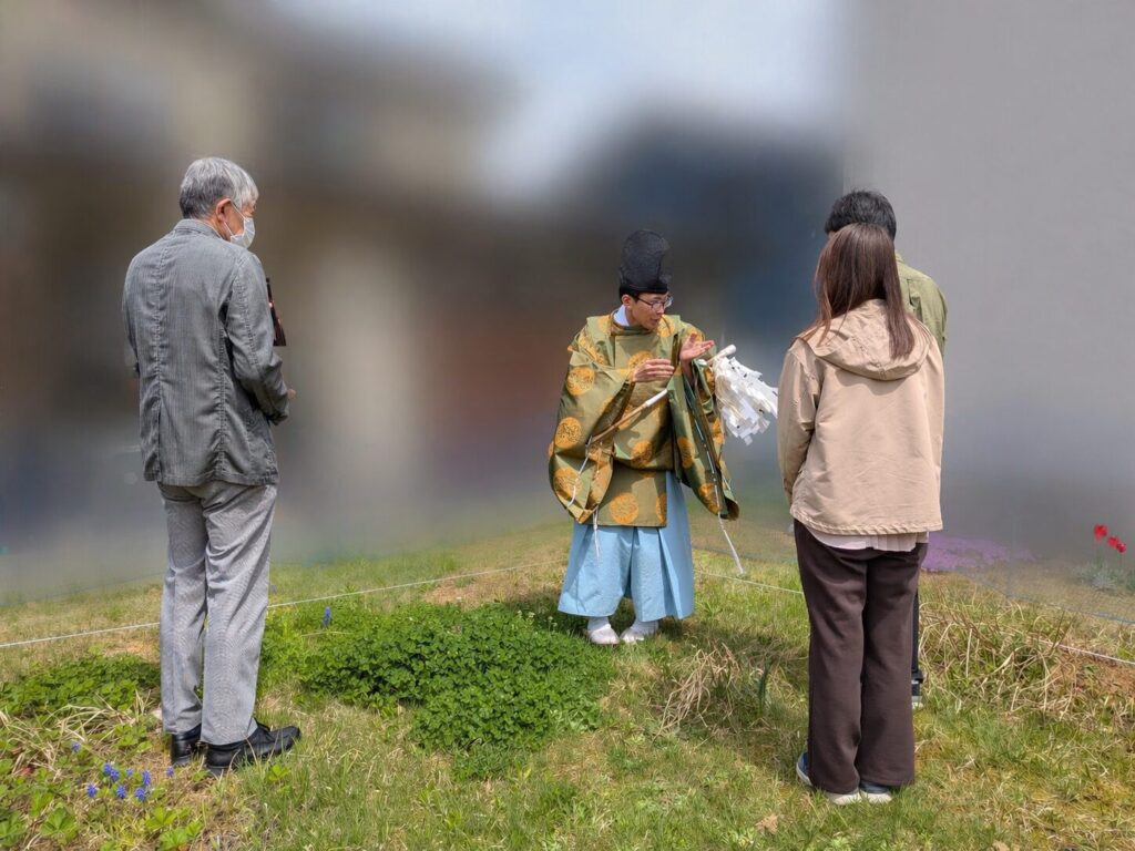 式典では、土地の神様に工事の無事を祈願する「地鎮祭」を執り行いました。Kさま、この度は誠におめでとうございます! 式の中では、土地の四隅を清める「四方払い(しほうはらい)」も行われました。神職がお米や塩を撒き、その土地を清め、これから始まる新しい暮らしを祈願いたします。