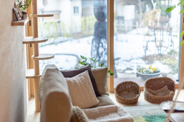 奥様 キャットポールかな。2匹の猫たちにとっても住みやすい家だといいなと思って、設置をお願いしました。建築家の伊藤さんが「こんな感じです」って模型も作ってきてくださるなど、すごく丁寧に仕上げていただきました。庭には、よその猫や鳥、蝶などが来るので、ポールに登って外を見てますね。