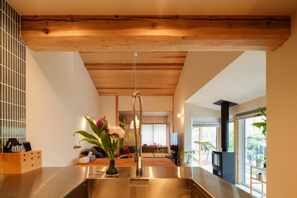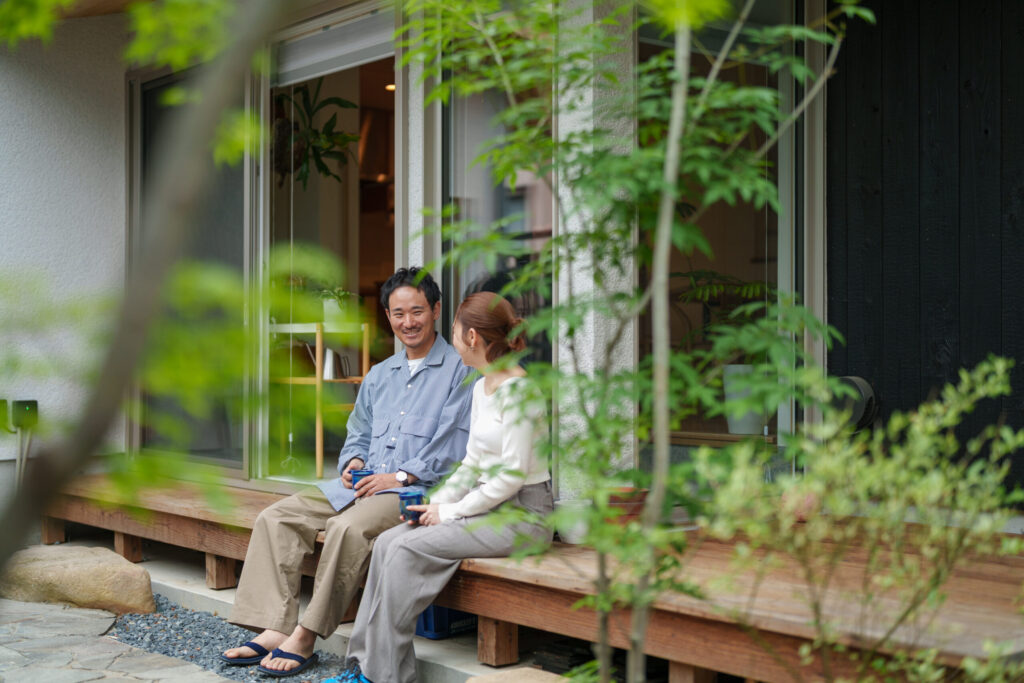 奥様も「キッチンからダイニング・リビング、そしてその先の畳コーナーにあるコーナーサッシからも庭が見えて、とても気持ちが良いんです」と、その心地よさを実感されています。リビングダイニングから土間へ、さらに土間からウッドデッキ、そして庭へと続く流れるような動線も、この住まいの大きな魅力です。