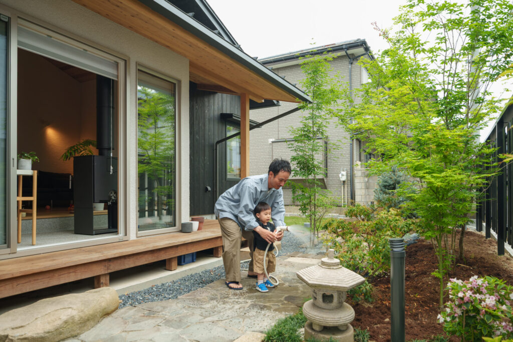 「家づくりのプランを立ててもらう際、本当にたくさんの要望を伝えました」と振り返るご主人。木の外壁や障子、畳といった和の要素、広々とした土間、そして「どこにいても緑が見えるように」という、庭との一体感を重視したご希望など、その内容は多岐にわたりました。さらに、「玄関に入ってすぐに庭が広がる景色が見たい」「床は幅広のオーク材がいい」といった細部へのこだわりも。