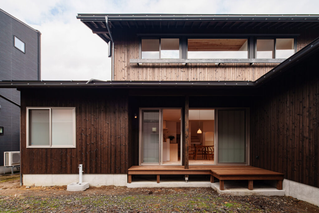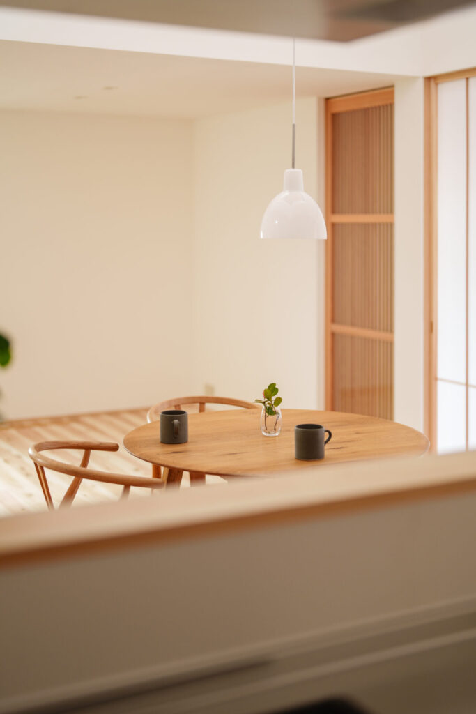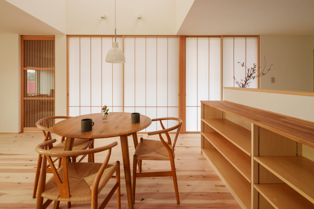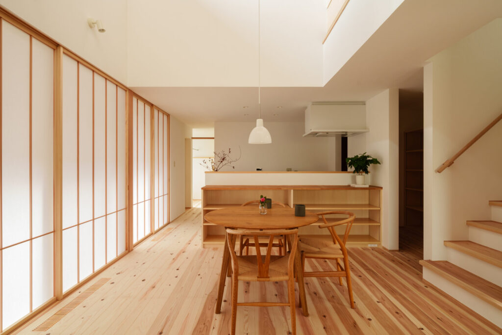 障子越しに広がる柔らかい光が、北欧家具の質感を美しく引き立てます。和のしつらえが持つ静けさと、北欧インテリアの温かさが共鳴する空間。ダイニングの吹き抜けからは冬の貴重な太陽光を効率よく取り込み、家中を明るく包み込みます。