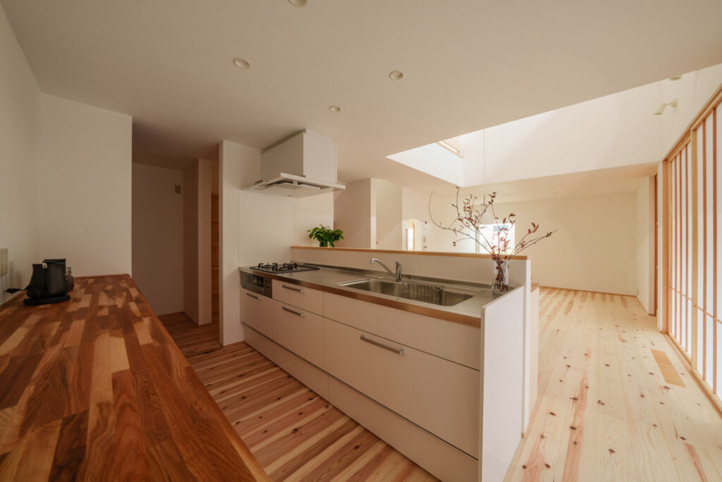 ヒュッゲな時間を生み出すのは、ゆとりある家事動線から。キッチンを中心にぐるりと回れる動線を確保し、料理中も家族の気配を感じながら、洗濯や片付けをスムーズにこなせます。整理整頓がしやすく、散らからない工夫が詰まった、奥様こだわりのポイントです。