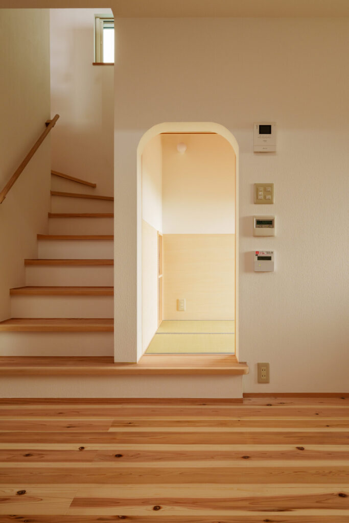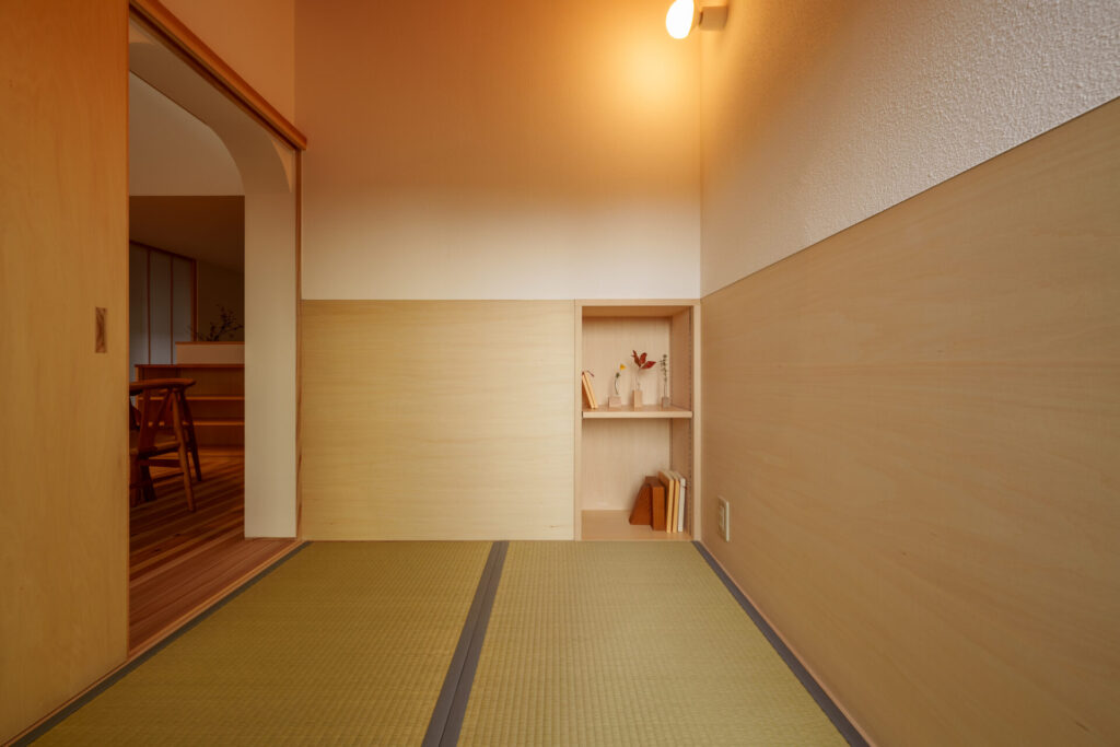 リビングダイニングの隣に設けられた「畳のヌック」。少し背の低いアーチ壁をくぐって入るその空間は、まるで茶室の「躙り口(にじりぐち)」のような趣です。北欧家具が並ぶ空間に溶け込む和の遊び心は、読書や一人の時間をより豊かにしてくれます。
